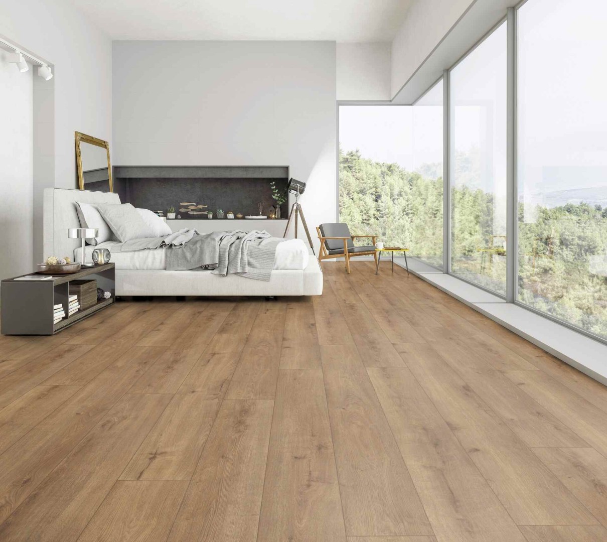 Современный дизайн: Ламинат Oak Capri представлен в классическом, чистом оттенке дуба, который подчёркивается крупным форматом доски. Такой пол выглядит дорого, солидно и лаконично.