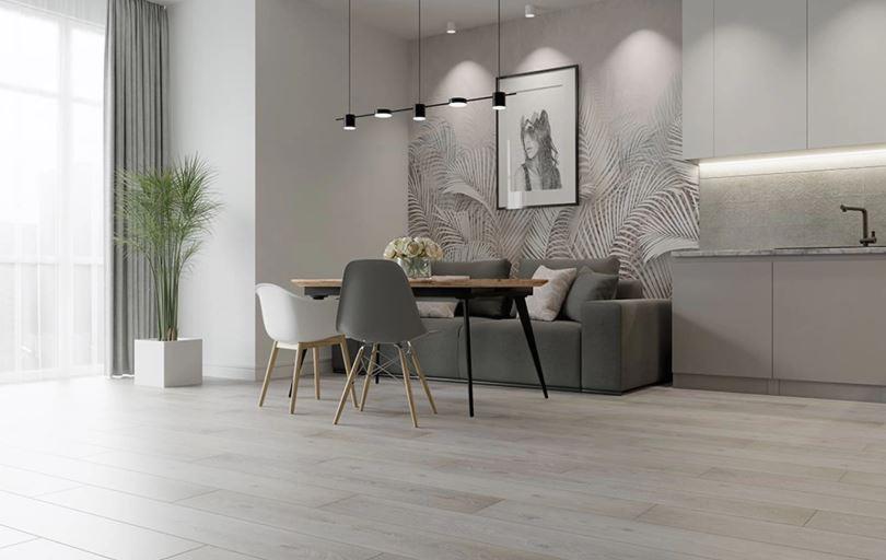Ламинат MSPC Stone Floor Дуб Зимний вечер передает спокойную и тёплую атмосферу зимнего вечера. Коллекция сочетает благородные холодные оттенки дуба с выразительной каменной фактурой, создавая ощущение умиротворения, комфорта и гармонии. Широкая доска 196 мм визуально расширяет пространство, наполняя его элегантностью и сдержанностью зимнего времени.
